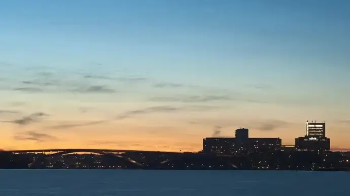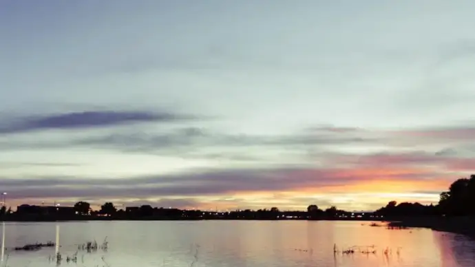 riverside city view at sunset