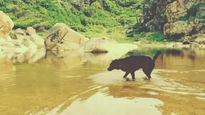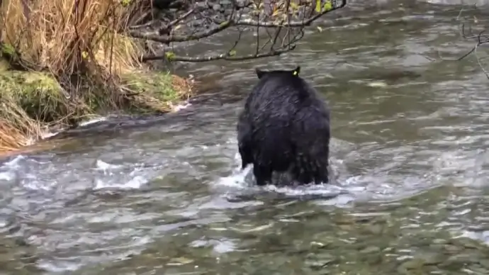 wild black bear catching fish on stream