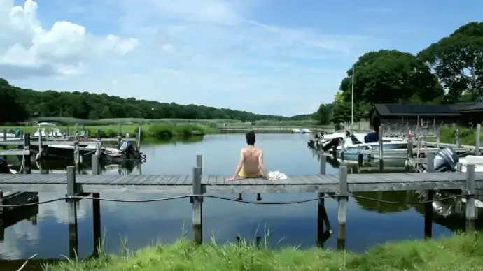 man relaxing on wooden bridge on calm river