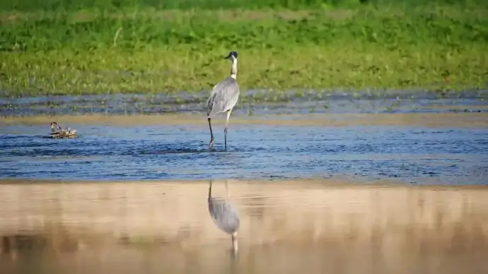 wild stork walking on lake