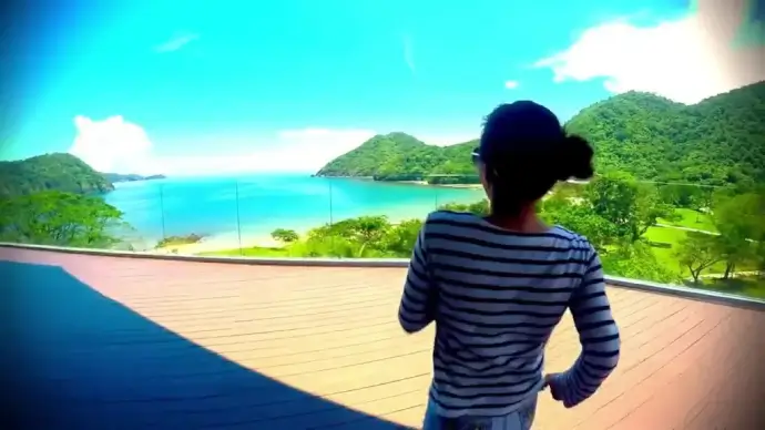 young woman joyful on resort balcony