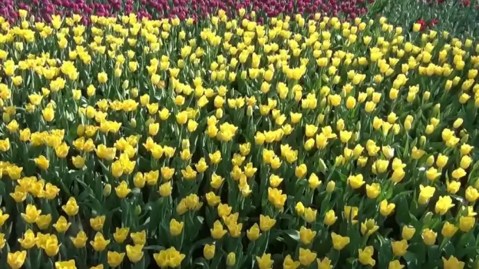 overview of beautiful fresh colorful tulips field