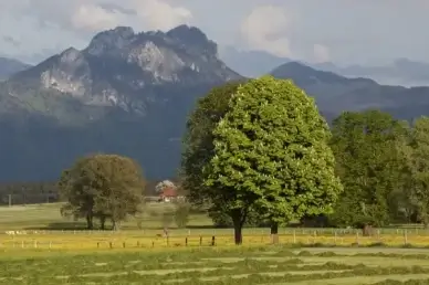 countryside scenery picture meadow trees houses scene