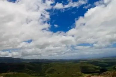 puffy clouds over green hills