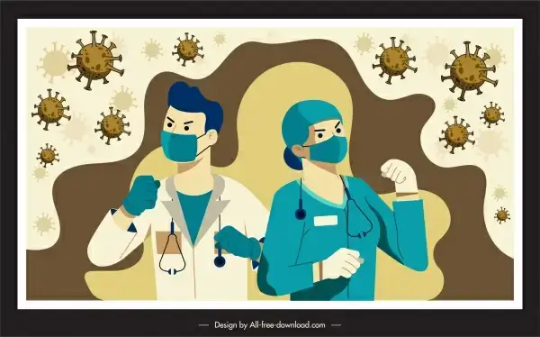 covid 19 banner antiseptic staffs stylized viruses sketch