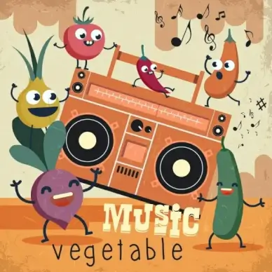 music vegetables background retro design funny stylized icons