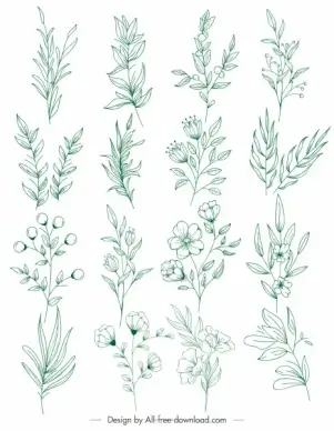floral plants icons classical handdrawn sketch