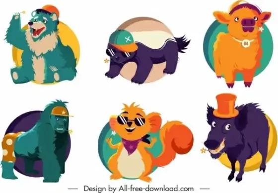 animals icons funny cartoon characters circles isolation
