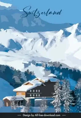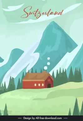 switzerland advertising poster template cartoon cow waving flat snow mountain scenery sketch