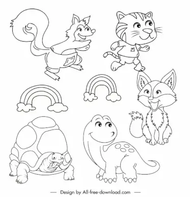 animals icons colorful cartoon peafowl turtle reindeer sketch
