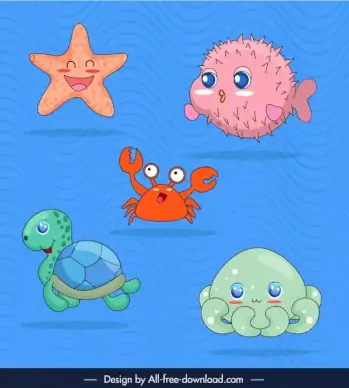 ocean animals icons seahorse turtle sketch handdrawn cartoon