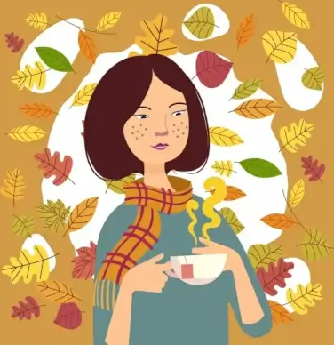 tea time poster template dynamic flying leaves cup pot hill scenery outline