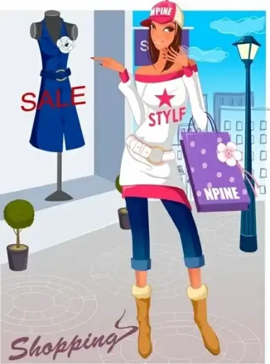 shopping background young fashionable girl icon cartoon character
