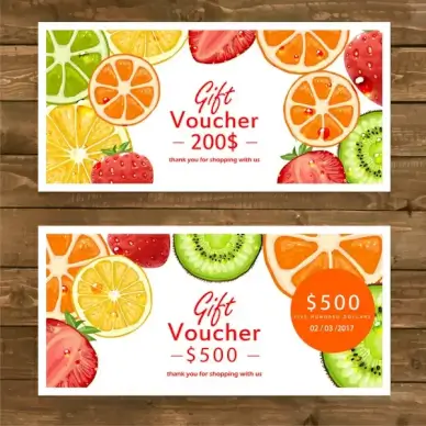 gift voucher vector illustration with various fruits background