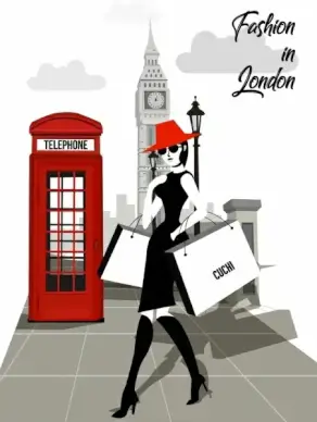 london fashion banner lady landmark icons cartoon design