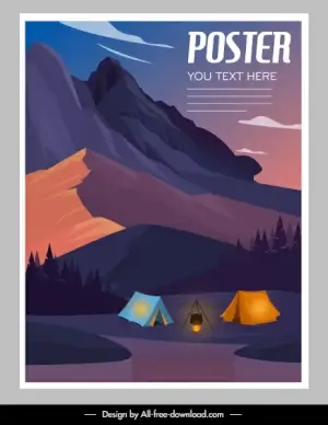 camping activity poster mountain scene sketch colorful design